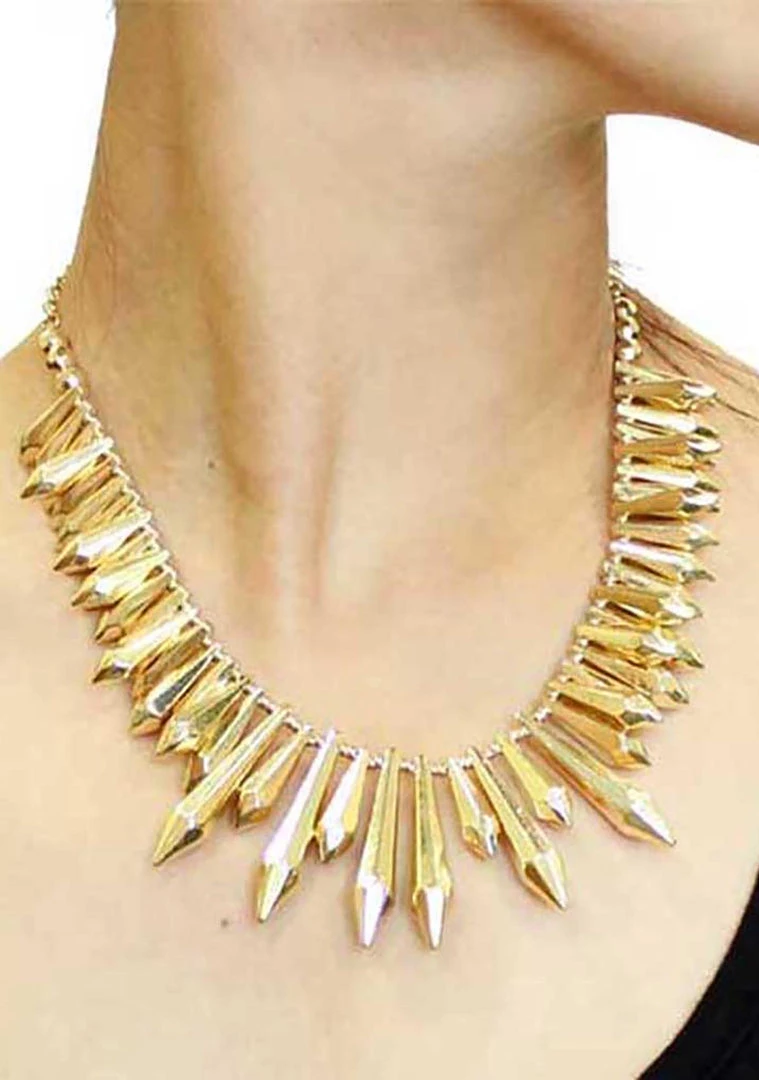 Check out this heavy weight bib-style statement necklace by 8 Other Reasons. The Expired cool necklaces features multiple cone pendants beaded gold plated hardware on a chain finished with an adjustable clasp and logo charm.