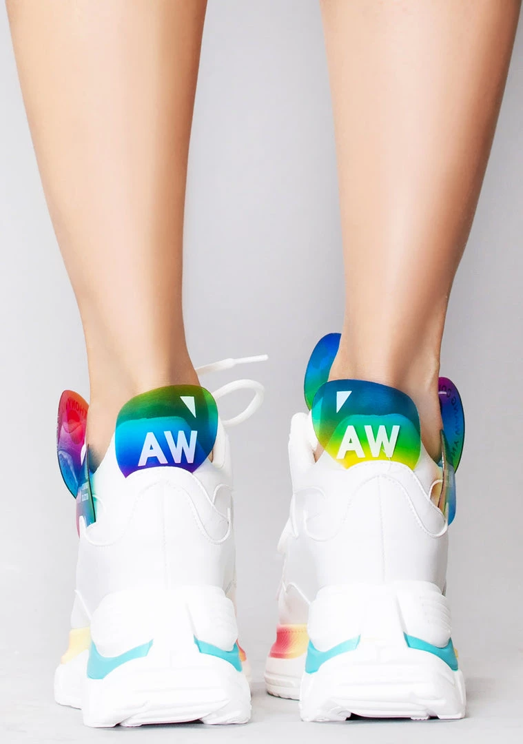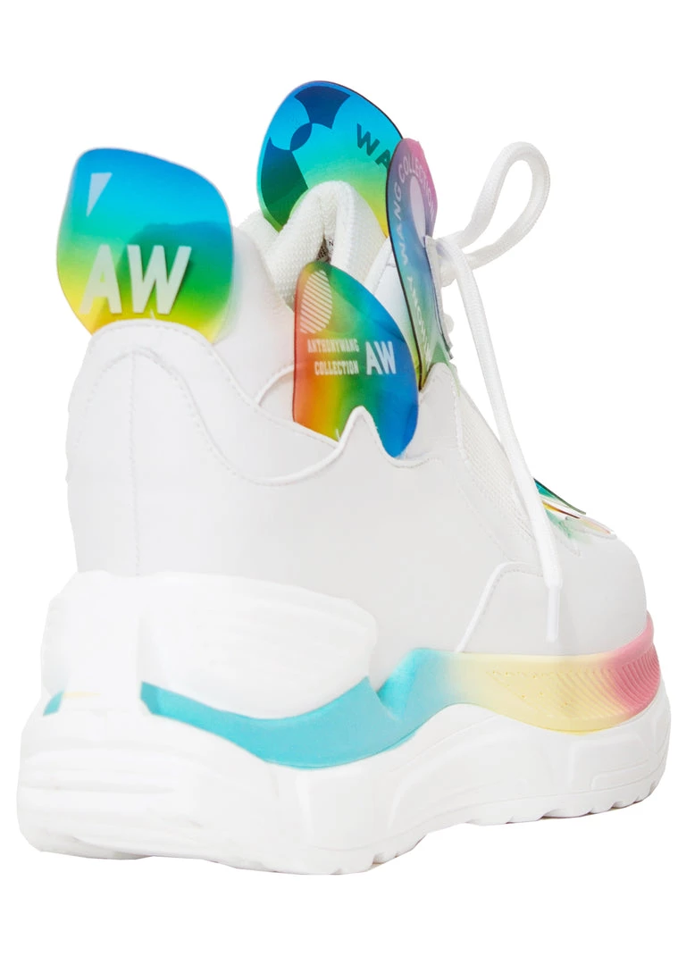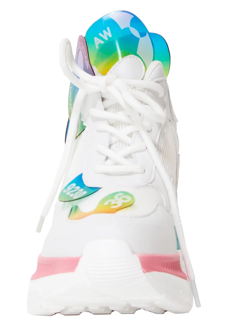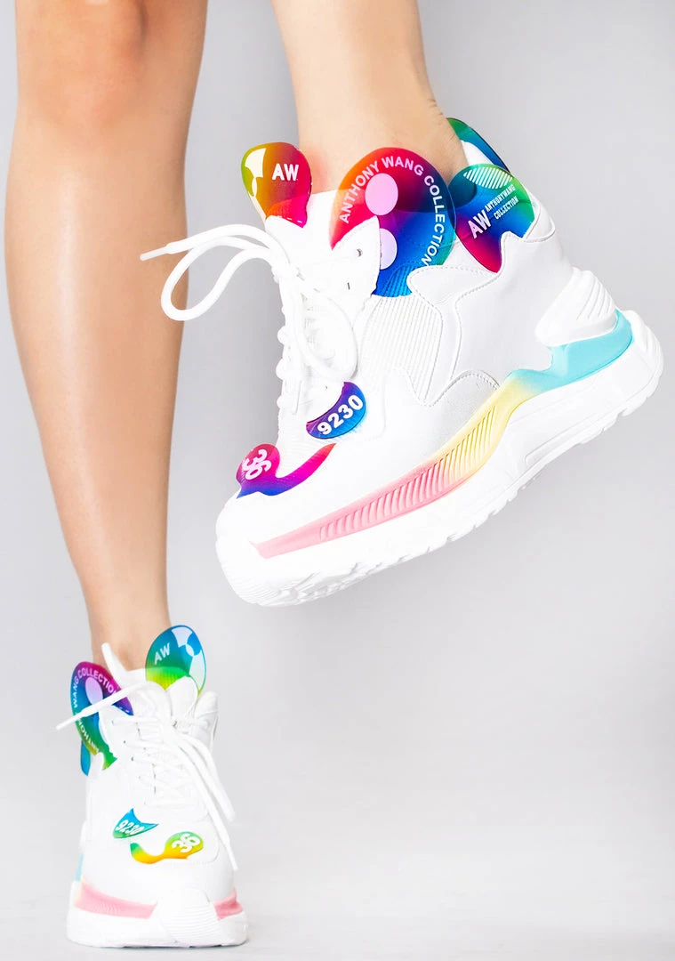 Step into a new world of color with the new Rainbow Wonderland Platform Sneakers from Anthony Wang. These groovy festival sneakers feature white colored vegan leather upper, lace-up front, rainbow tab details, and hidden wedge heel. The dance floor never saw moves so vivid.