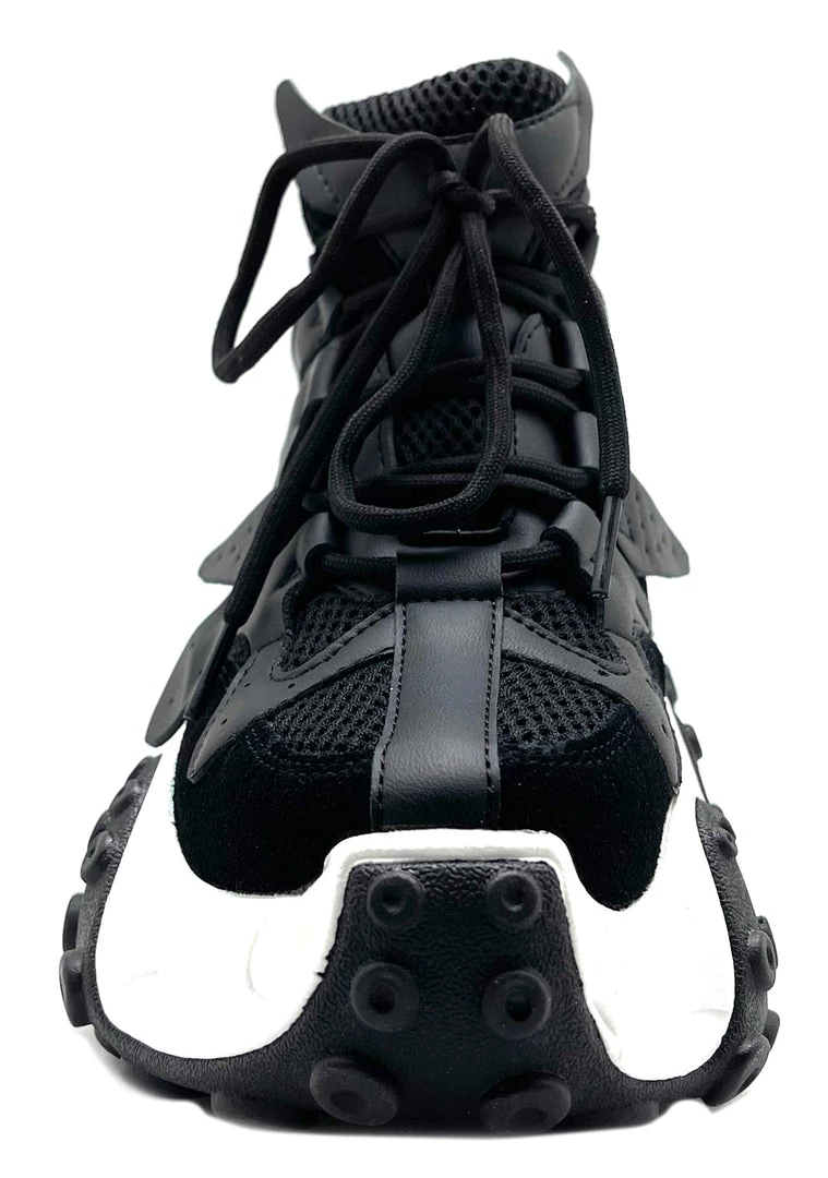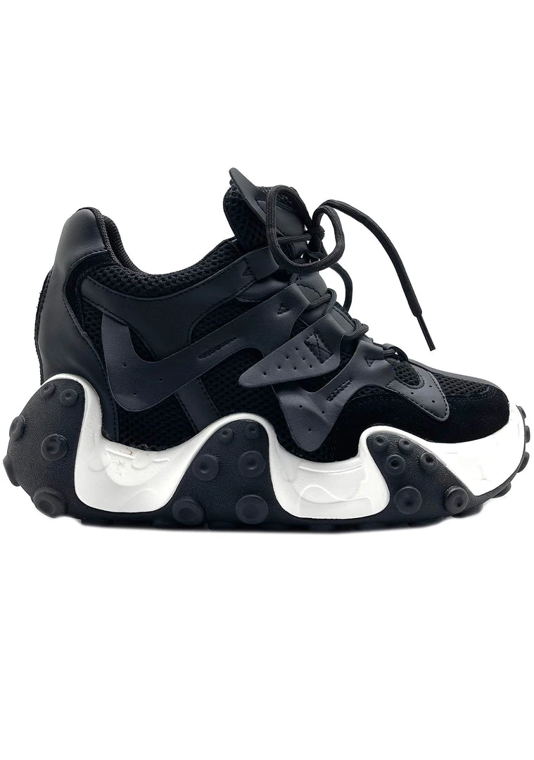 Go full speed in the Split Second Platform Sneakers from Anthony Wang. These fabulous festival platform sneakers feature an all-black vegan multi-material upper, lace-up front, contrast black and white tentacle detail bottom, and hidden interior wedge.