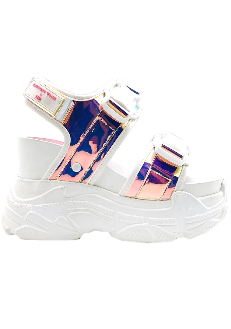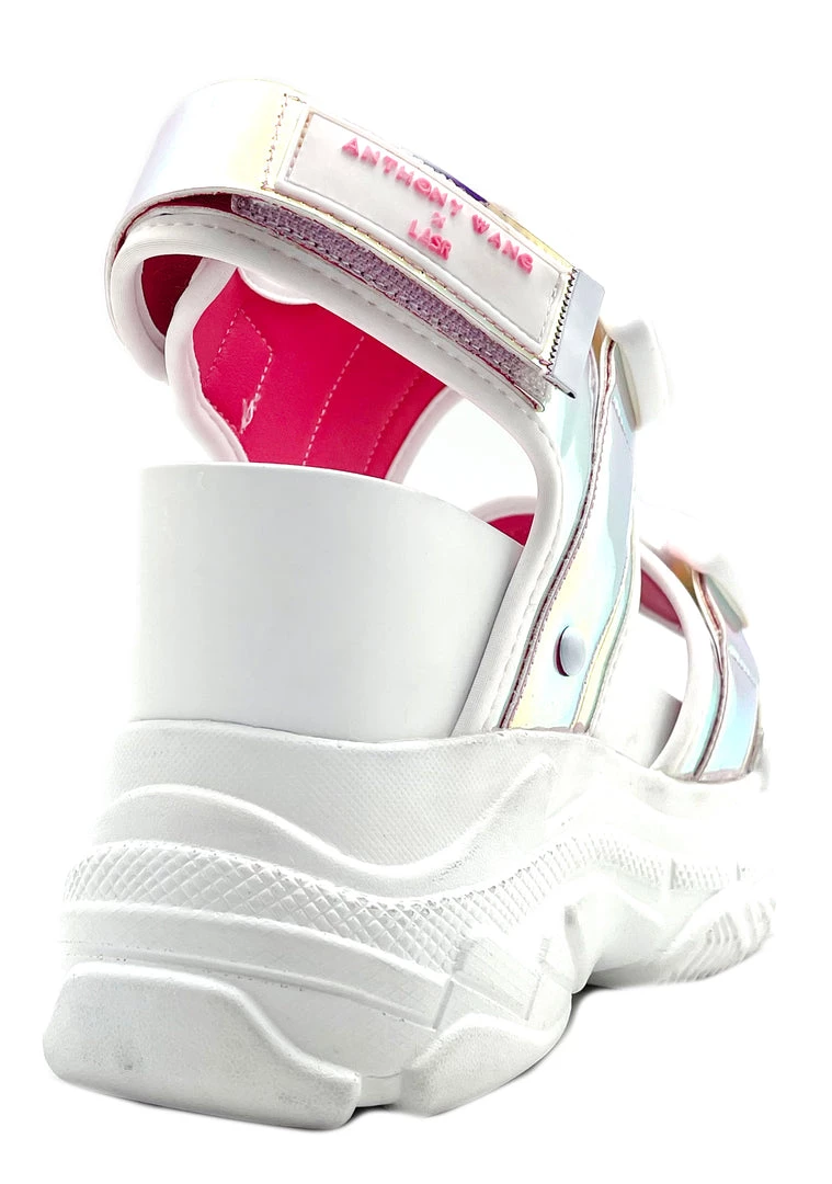 No one moves like you in the LASR Exclusive Virtuosity Platform Sandals from Anthony Wang. These fabulous festival sandals feature a white breathable padded mesh upper with multiple daring snap buckle closures, Iridescent contrast details, matching flexible foam wedge platform insole, and major traction outsole. With these cute sandals, you and the music are one!
