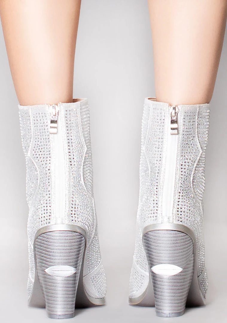Show them your moves in the Stars Collide Rhinestone Boots from Azalea Wang. These cute festival boots feature a silver vegan leather upper encrusted with rhinestones, notch heel detail and zipper closure up the pack. Slip on these cute boots and dance.