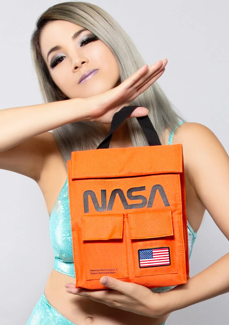 Take your meal out of this world with the NASA Lunch Sack from Bioworld. This cool lunch bag features an all orange outer with NASA details and double pocket accents, fully insulated interior, top carry handle, and roll top closure with velcro seal.