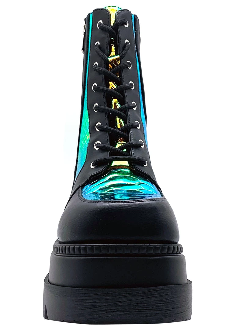 Party all night long with the Radioactive Platform Boots from Cape Robbin. This punk rock rave boots features black colored vegan leather upper with yellow/orange iridescent python contrast, lace up detail, zipper opening at inner side for easy slip-on, microfiber lining, and super lightweight chunky platform outsole. Steer clear of the dance floor!