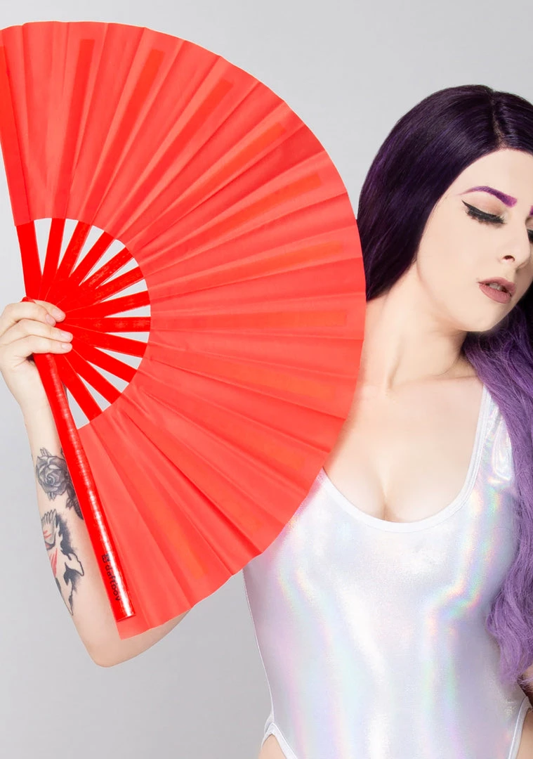 You came to play and slay with the Daftboy Scarlet Rush Fan. This festival hand fan has solid rivets and natural bamboo ribs to open and close with the snap of your wrist. The lightweight fabric gives off the ultimate thwarp to steal the show.
