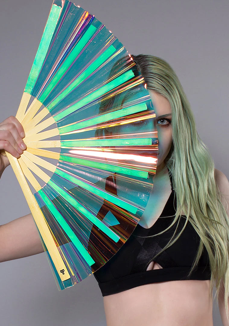Put ‘em in euphoric bliss with the Daftboy Fluid Fantasy Iridescent Fan. This so necessarily extra festival fan features Daftboy’s signature clear iridescent fabric, mesmerizing holographic colors that reflect and refract with light, durable solid rivet and renewable bamboo ribs for sustainability. This cooling holographic rave fan will have you looking like a blinding space goddess.