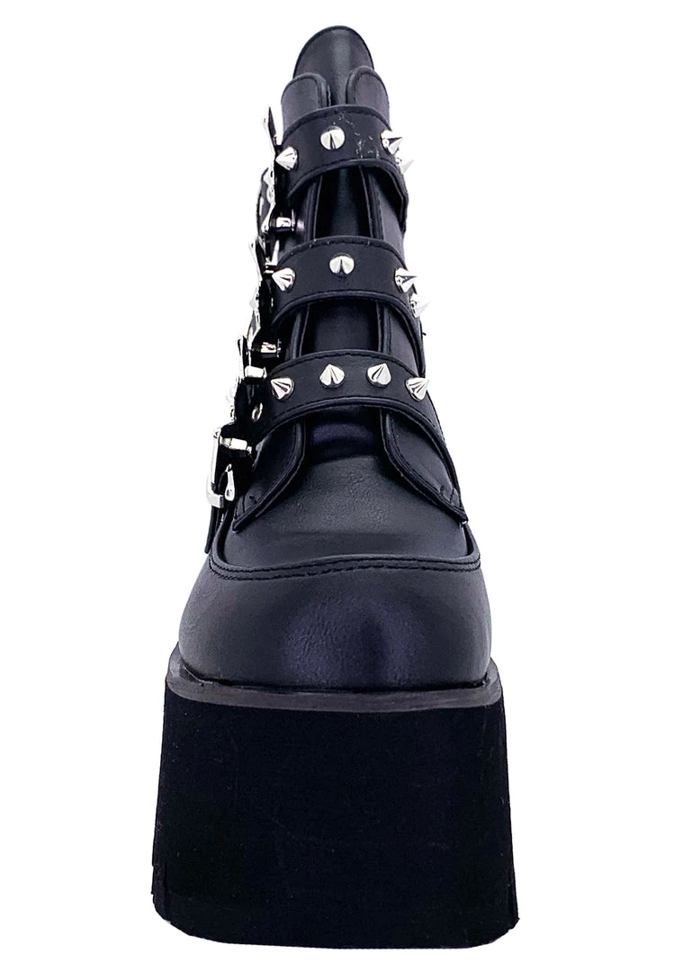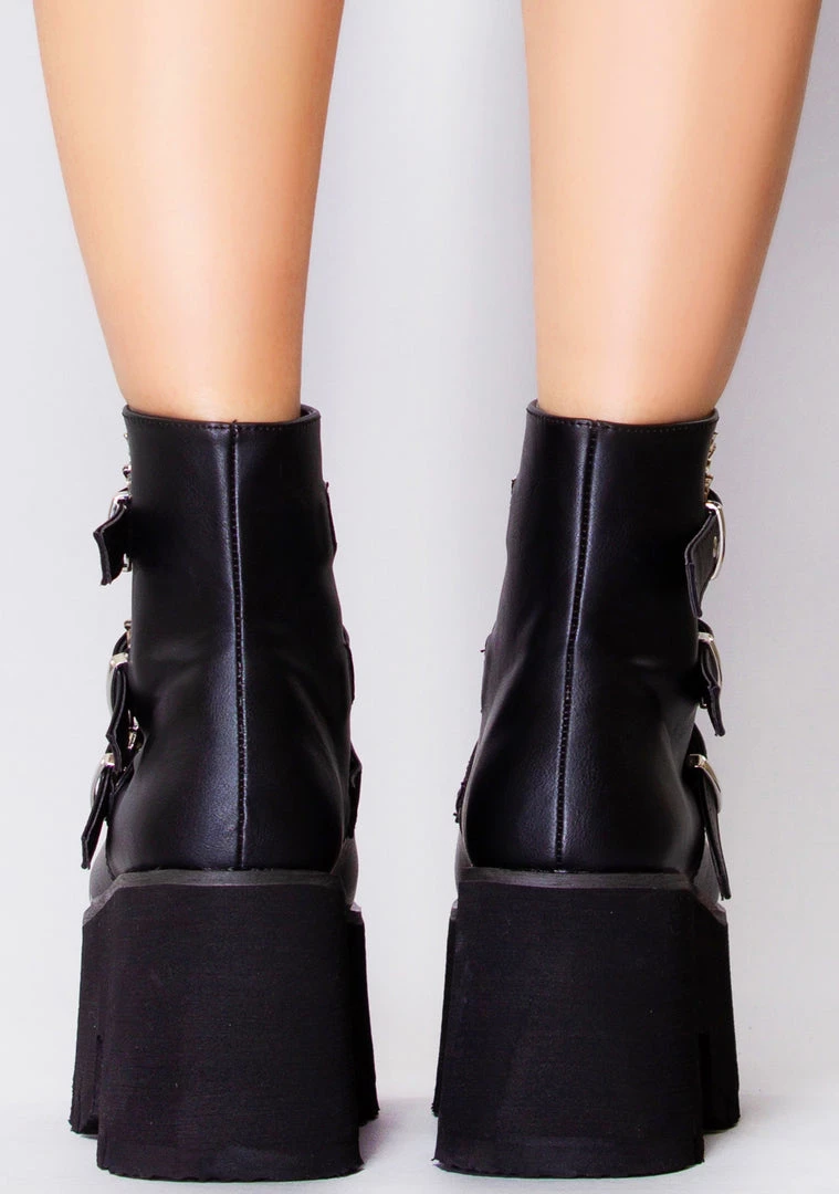 Be the best baddie in the cave with the Demonia Bat Out of Hell Platform Boots. Made with premium quality vegan leather, these wicked festival boots feature sinful all-over stud accents, arresting silver toned hardware, staggering bat buckle details, strappy style closure and chunky platform heel. These vampy rave boots will have you flyin’ high through the night.