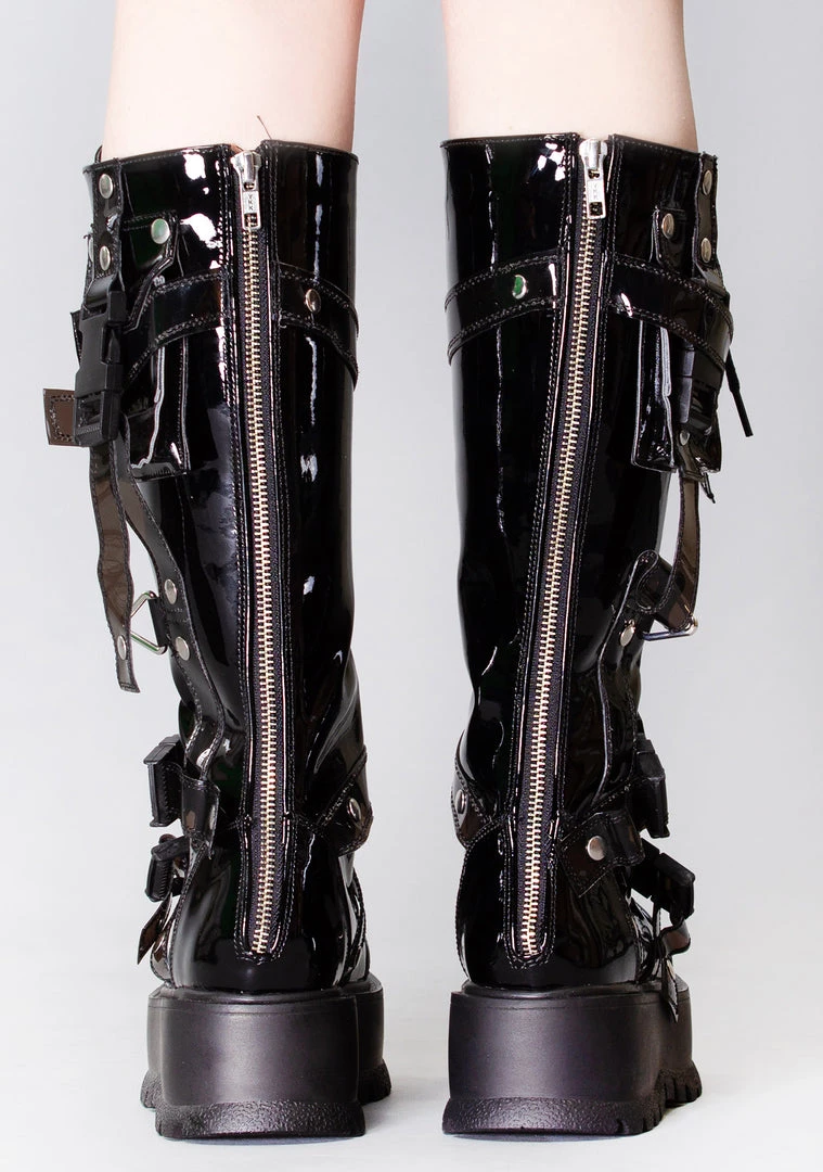 Take down barriers with the Breakdown Combat Platform Boots from Demonia. These bada$$ platform boots feature an all-black vegan patent leather upper, lace-up front, clip buckle strap detains, silver rivet accents, zipper closure up the back, and attached tactical pouch. With these boots nothing and no one can stand in your way.