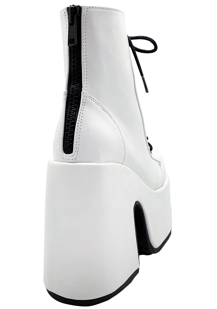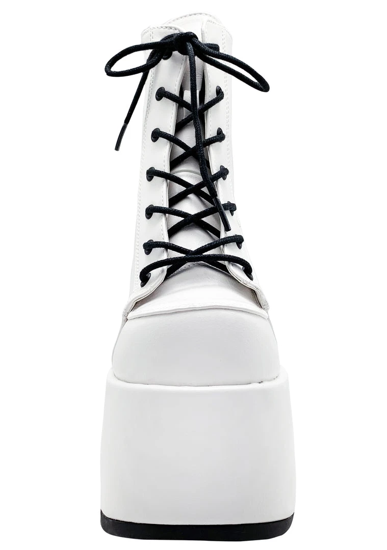 Keep your best nights on repeat in the Deja Vu Platform Boots by Demonia. These 5” boots feature white vegan patent leather uppers with super chunky platform heels, black lace-up detail, and back metal zip closures. with these boots the good times will never end.