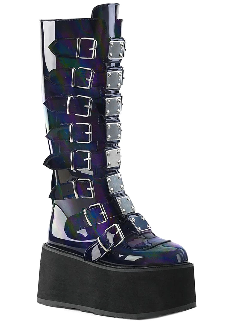 Party in your own world with the new Delusional Dream Platform Boots from Demonia. These unreal mid-calf festival boots feature a holographic black vegan leather upper, buckle up front with silver plate detail, and back zipper closure. Why live in the real world when you can just create your own?