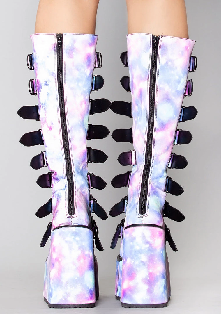 Dance the night away while stars collide in the Galaxy Burst Platform Boots. These stellar festival boots feature a vegan reflective upper with printed galaxy details, 8 buckle straps up the front with metal plate accents, and zipper closure up the back. #supernovagirlÂ