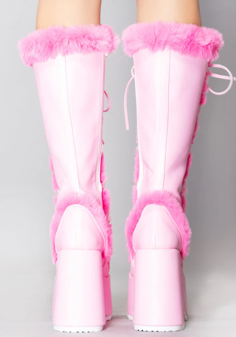 You’ll be a love monster with the Mad About You Platform Boots from Demonia. These ferociously cute festival boots feature a pink vegan suede outer, hot pink contrast faux fur lining, lace-up front, interior zipper closure, and 5″ heel. When you want them nothing will stand in your way.
