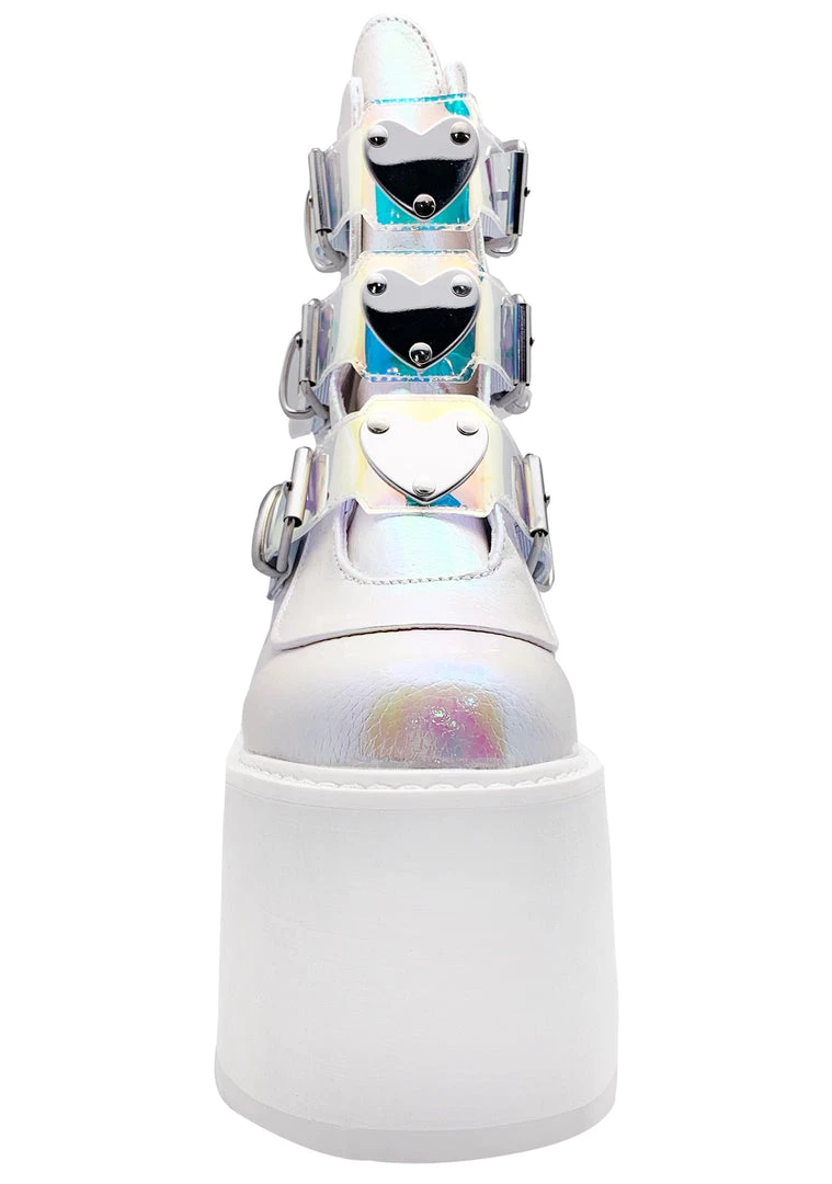 Fulfill your mission in the Swing Strapped Iridescent Platform Boots in Pearl by Demonia. Get your intergalactic stomp on with these pearl iridescent platforms made with vegan materials. 5 ½” chunky heels featuring 3 heart buckle straps with metal plates at center, holographic vinyl straps, and back metal zip closure. ‘Cuz love is a battlefield.