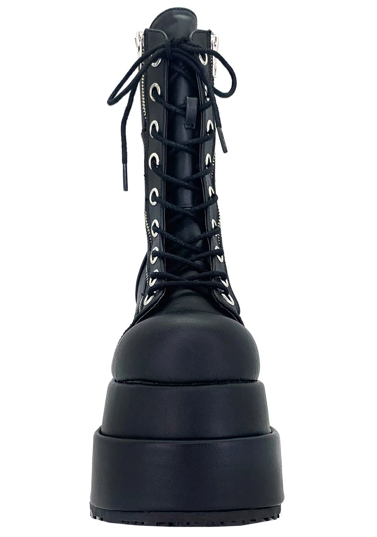 Step into my deviant world when wearing the Twisted Mind Platform Black from Demonia. This insanely sick platform festival boots features a full-on black vegan leather upper with lace up details in the front, silver metal zipper closure on the sides, and extra tall platform heel with traction outsole. Reality check, never!