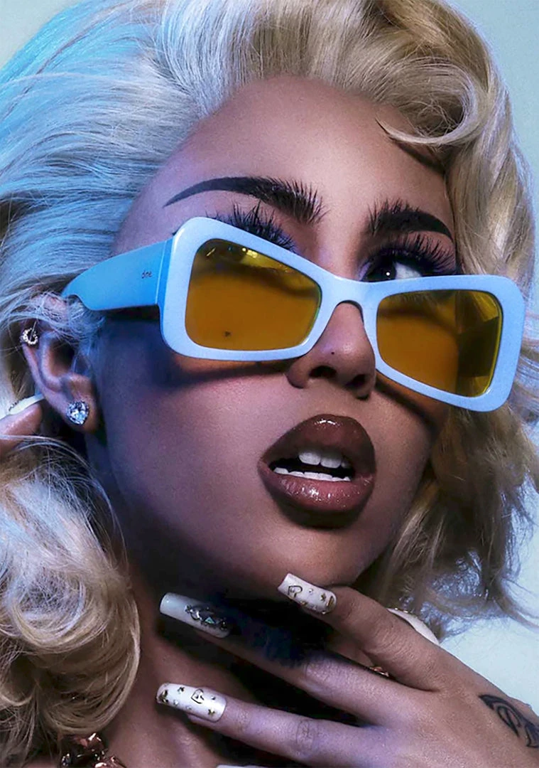 Amp up your summer look with the Kali Uchis Kali Sunglasses from Dime Optics. These super cute festival rave sunglasses feature a light blue new style cat-eye frame, polarized yellow lenses, dime. brand logo on the stems and X etched right lens. Stay timeless & edgy with these hot shades.