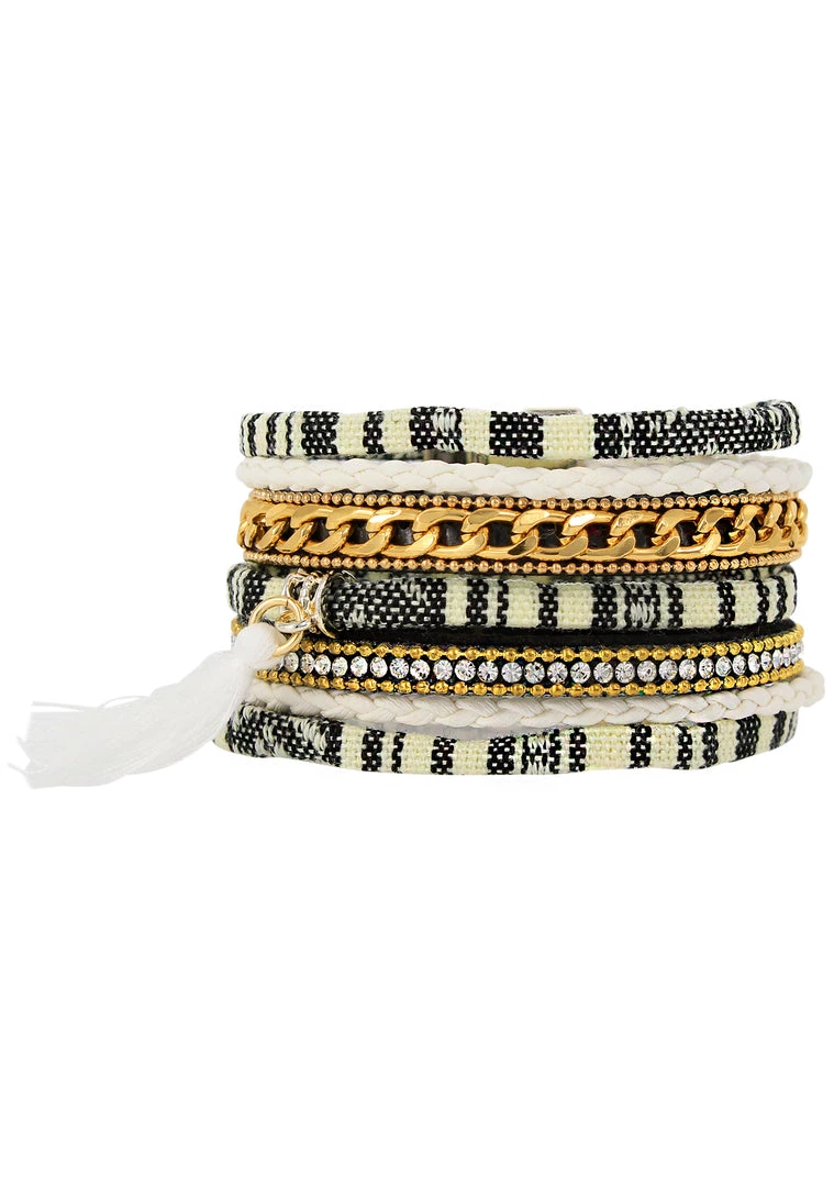 Make their dreams come to true with the Erimish Dream Weaver Bracelet. This decorative punk bracelet features an appealing layered wrap style, engaging black and white woven pattern pieces, exquisite gold and chain link detailing, heavenly clear rhinestone embellishments, ravishing white tassel side embellishment and magnetic snap closure. You couldn’t get any dreamier than this.