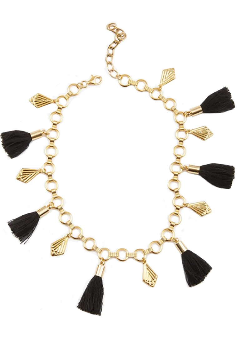 Summer may be coming to an end, but you can keep the vacation going with this Bahama Mama choker from Frasier Sterling. The Bahama Mama Festival Choker features black tassels and gold pendants on a gold plated hardware choker necklace and lobster clasp closure.