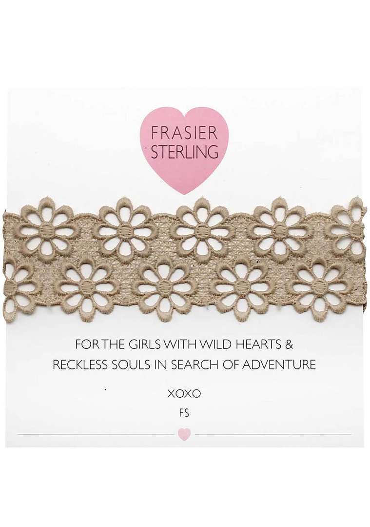 Every girl needs to get their hands on these dainty chokers from Frasier Sterling. The Lacey Daisy Festival Choker features a tan colored cotton lace daisy choker with gold plated lobster clasp closure.