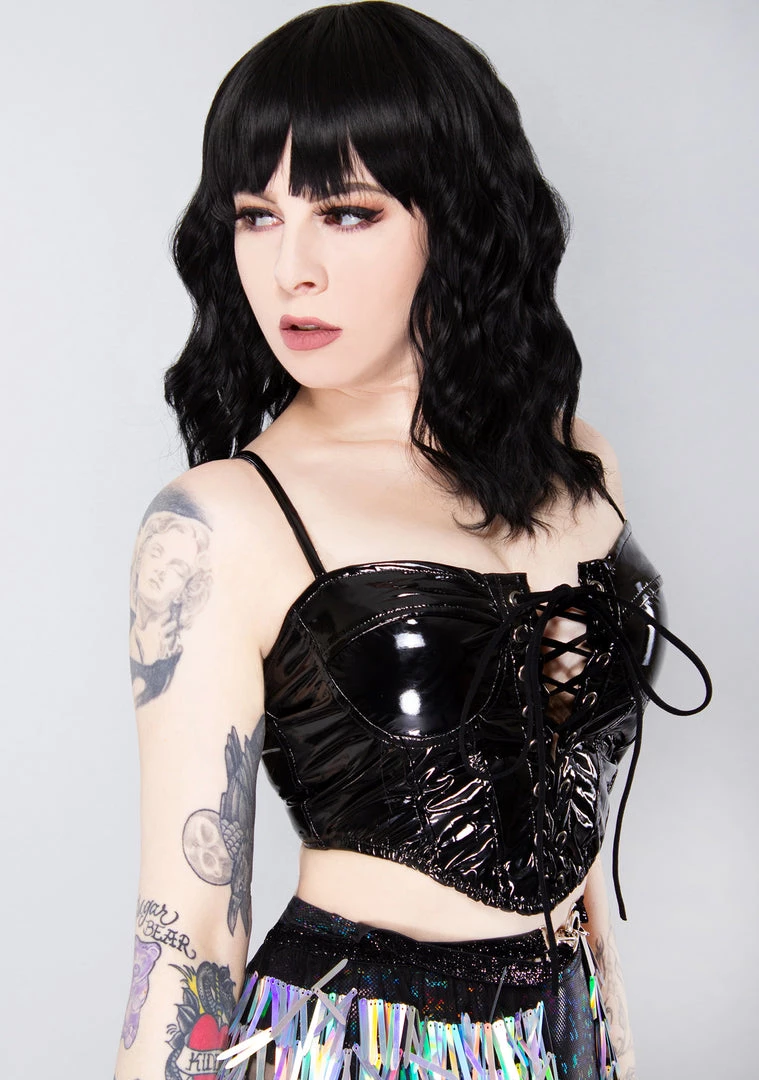 Give in to your darkest fantasies in the new Sinful Desire Latex Corset Top from Hot & Delicious. This sexy black festival top features a latex look construction, lace up corset front, silver eyelets for binding support and adjustable straps. #liveinsin