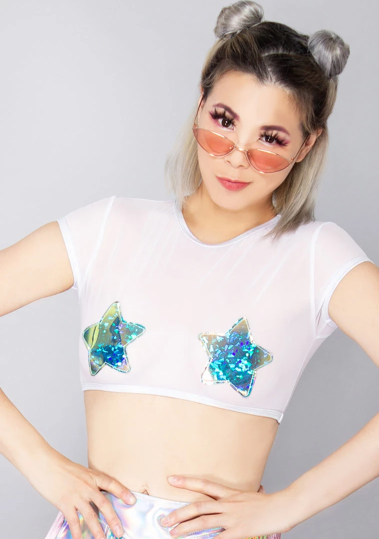 Outshine everyone on the dancefloor with the Bright Lights Mesh Cropped Top from J Valentine. This stellar festival top features a white mesh cropped top with vinyl star appliqué details and holographic trim. No one is brighter than you with this cute top.