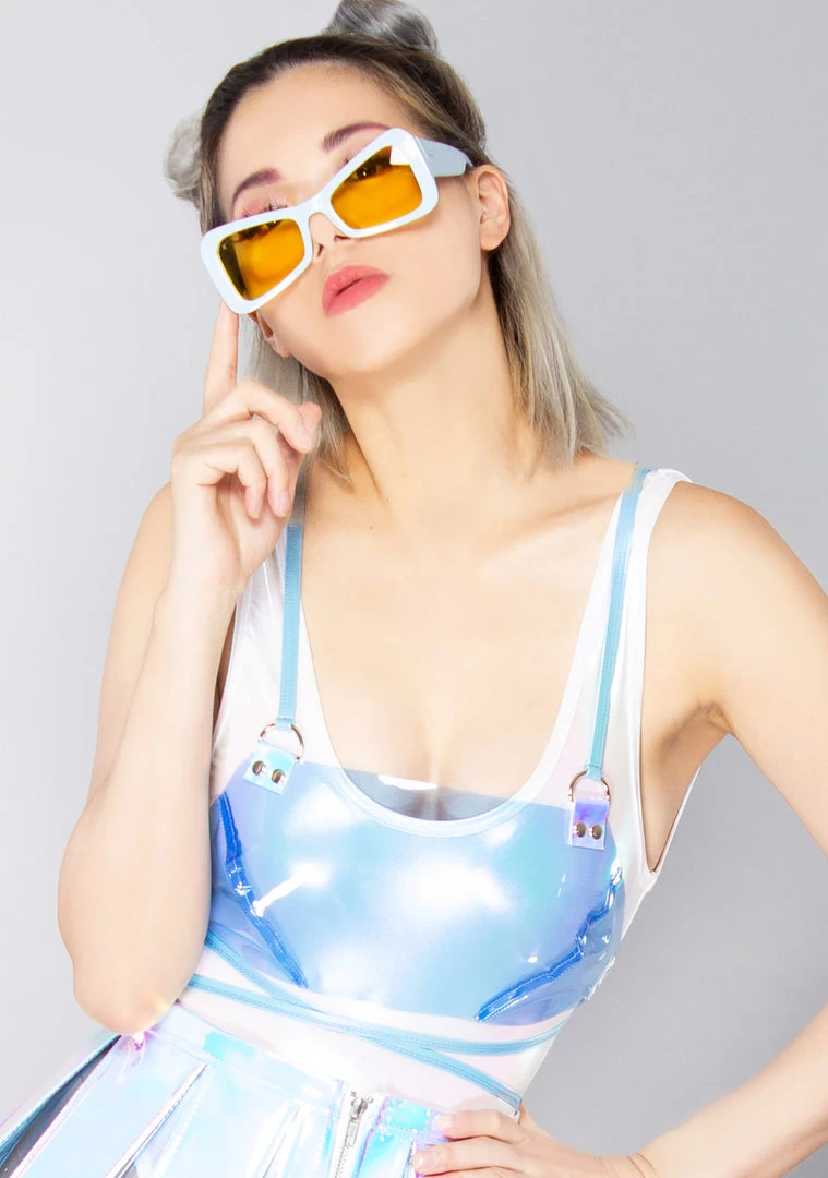 The Delusional Vinyl Top from J Valentine will have them going out of their minds. These sexy festival tops feature a sheer blue vinyl top with iridescent details and multi-style self-tie straps. With this cute top, they’ll be going crazy over you.