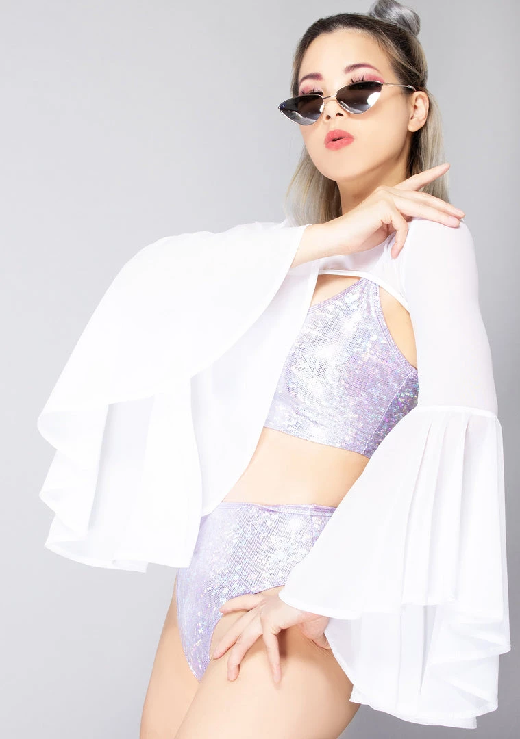 Ascend to the skies with the Levitate Bell Sleeve Shrug from J Valentine. This heavenly festival top features a white mesh shrug with flowing bell sleeves. Slip on this cute top and dance among the clouds.