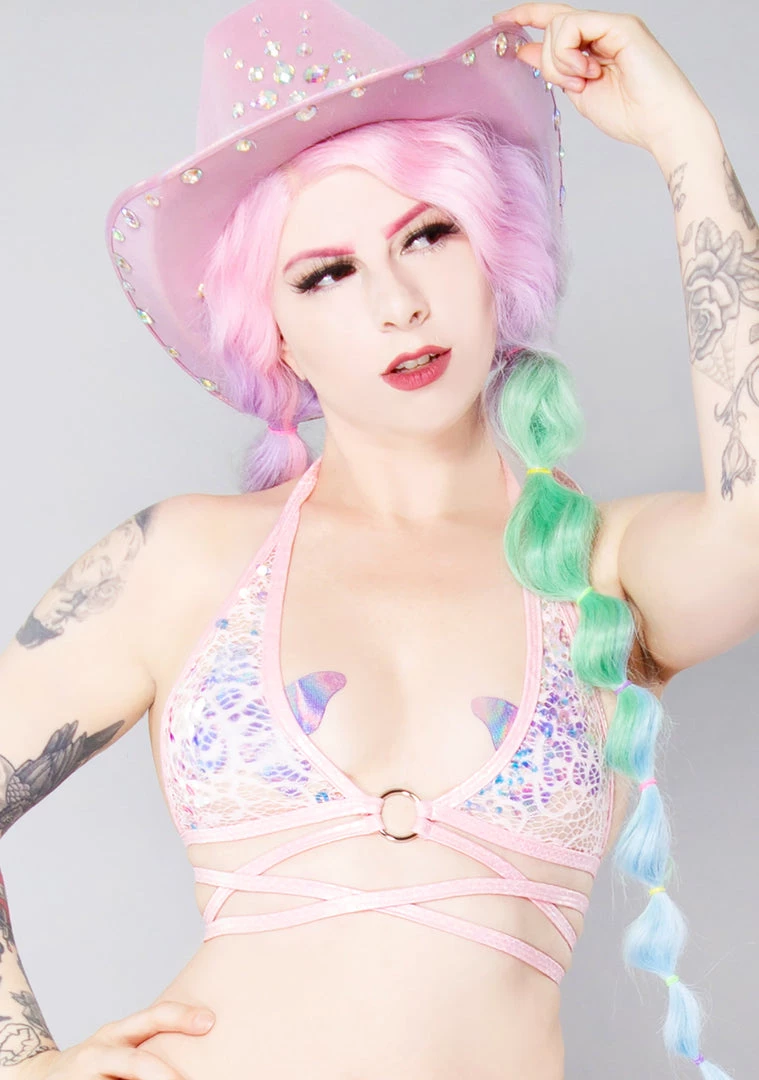 Get them falling for you while dancing in these romantic Love Story Net Wrap Top from J Valentine. These swoon-worthy festival tops feature pink see-thru lace with sequin accent, cross wrap straps with a sexy o-ring detailing, and back tie closure. Go and dance with a stranger and write your special love story with them.