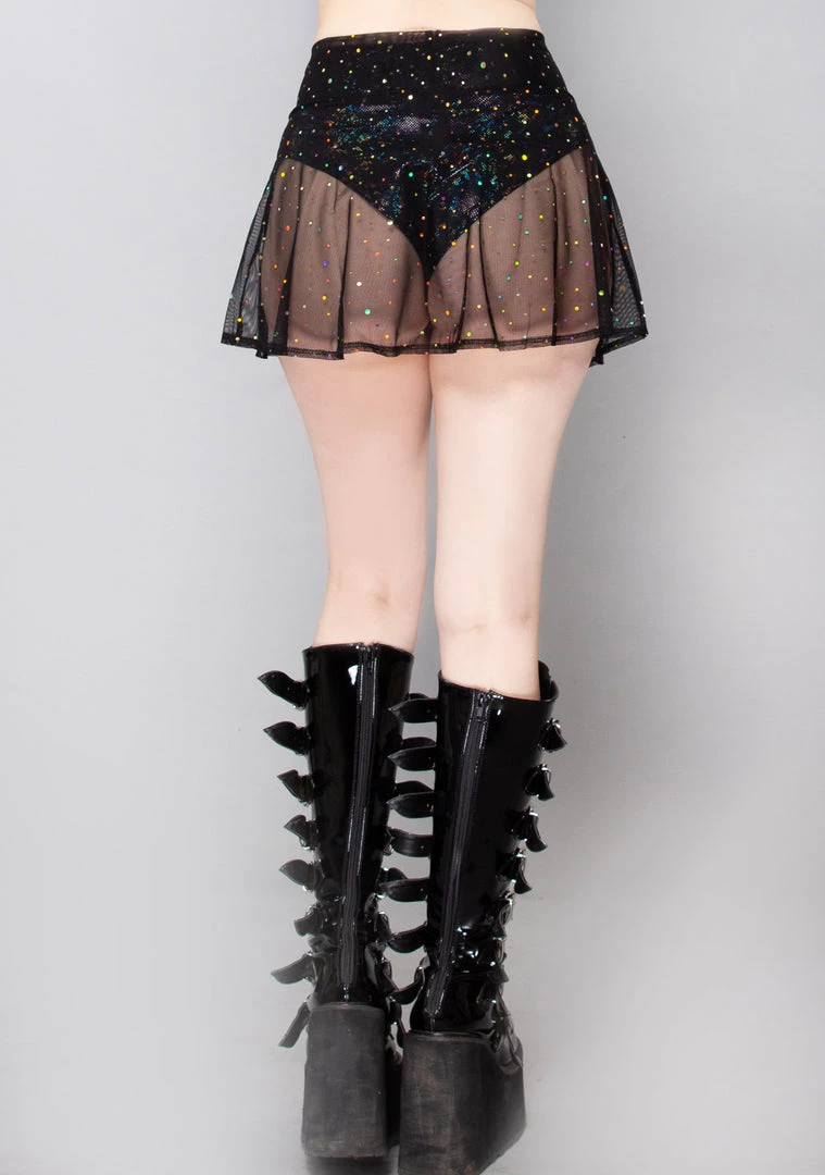 Luminate and glide across the dance floor while wearing the Mystic Firefly Mesh Skater Skirt from J Valentine. This tantalizing festival skirt is made of a black sheer mesh fabric with sequin and features a sultry high waistline and tempting a-line hem. With this cute skirt, you’ll never lose your sparkle.