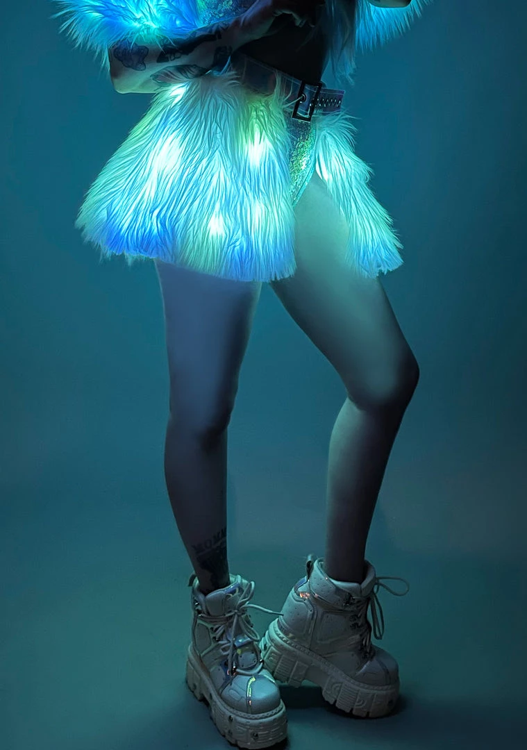 Whisk them away to your world with the Mystic Glow Light Up Belted Skirt from J Valentine. This alluring rave bottom features an all-white faux fur open front skirt with built-in green and blue lights and an attached holographic belted waist. Match this cute bottom with the Mystic Glow Light Up Shrug and enchant everyone on the dance floor!!