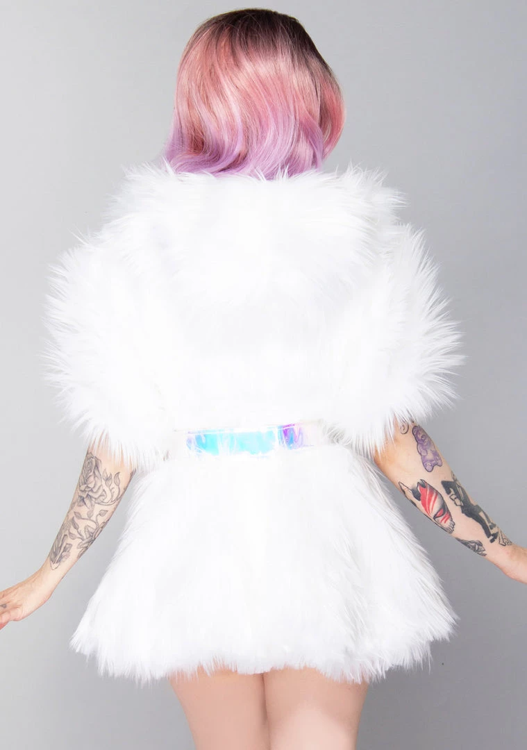 The Mystic Glow Light Up Shrug from J Valentine will have the entire dance floor under your spell. This enchanting festival jacket features an all-white faux fur shrug with built-in green and blue lights and an attached hood. Match this cute top with the Mystic Glow Light Up Belted Skirt and whisk them away to your world!