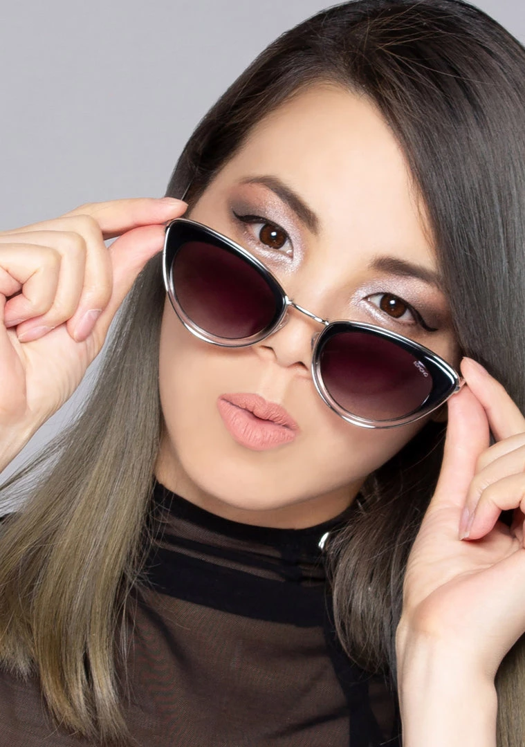 Sassy cat eyes are always fashionable, so rock the dope Bethany Dusk Sunglasses by Komono! Embodying a true summer night colorway with gradient smoke lenses. Ultra slim metal frames, temples, and nose bridge. UV400 protection with scratch resistant polycarbonate lenses for the playful felines. Custom silicone nose pads. Cleaning cloth and zip case included. Made to compliment your fierce, fancy attitude.