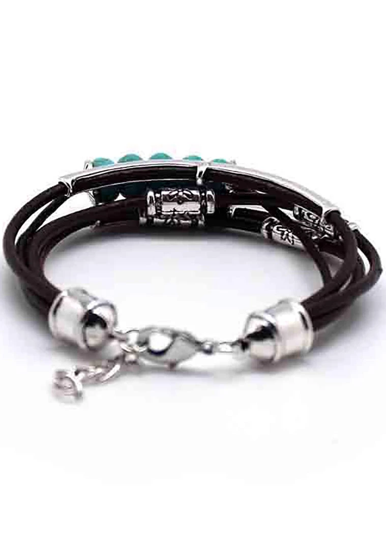 Bring the culture of Bohemia wherever you go with this Bohemian bracelet by 7 LUXE. This Punk Bracelets features multiple PU leather cord strands with silver embellish tube beads and turquoise stone beads detailing.