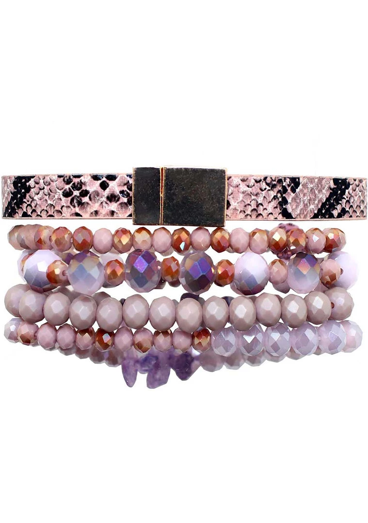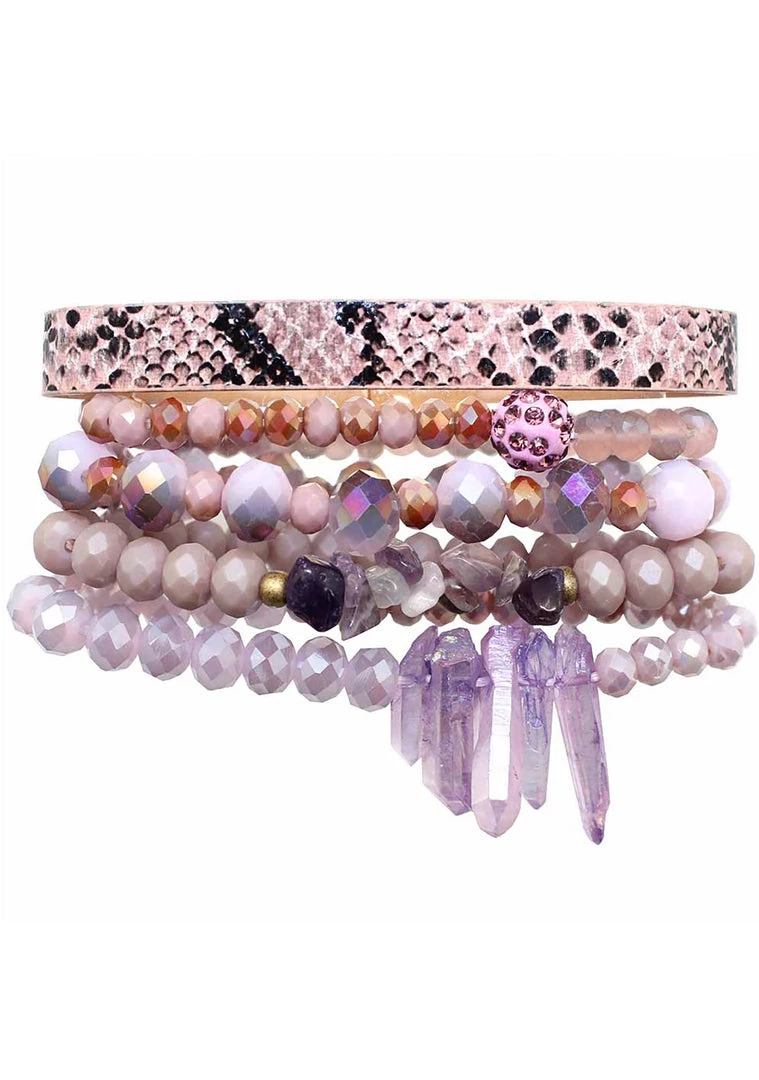 Give any look a luxurious vibe when you wear the gorgeous Lavish Bracelet Set. This Punk Bracelets set features four different lavender colored bracelets made with a mixture of high quality beads, stones, and crystals and one purple python cuff . Stack them up or wear one alone!
