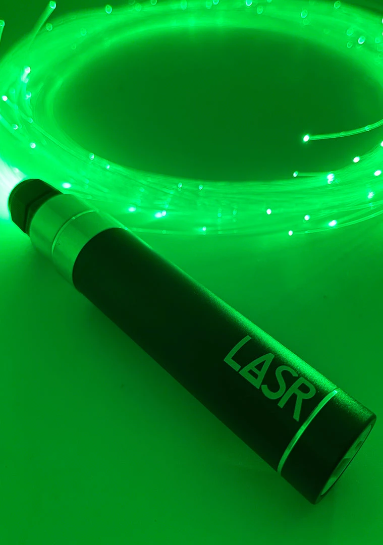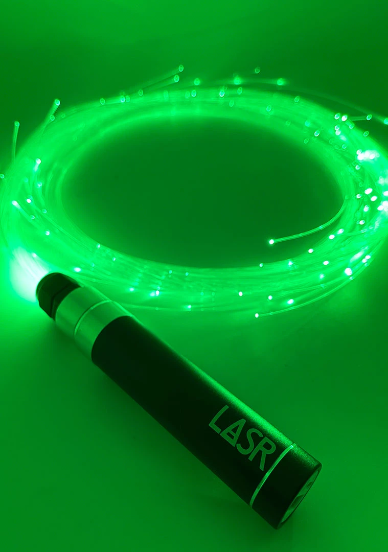 You ready for a wild ride?! Let’s speed things up with the Nitro Velocity Fiber Optic Light Up Whip from LASR. These swift rave accessories feature a sleek black handle with an on/off switch, green LED lights, and multiple fiber optic strands. Go on tell ’em better not blink or they’ll miss you.