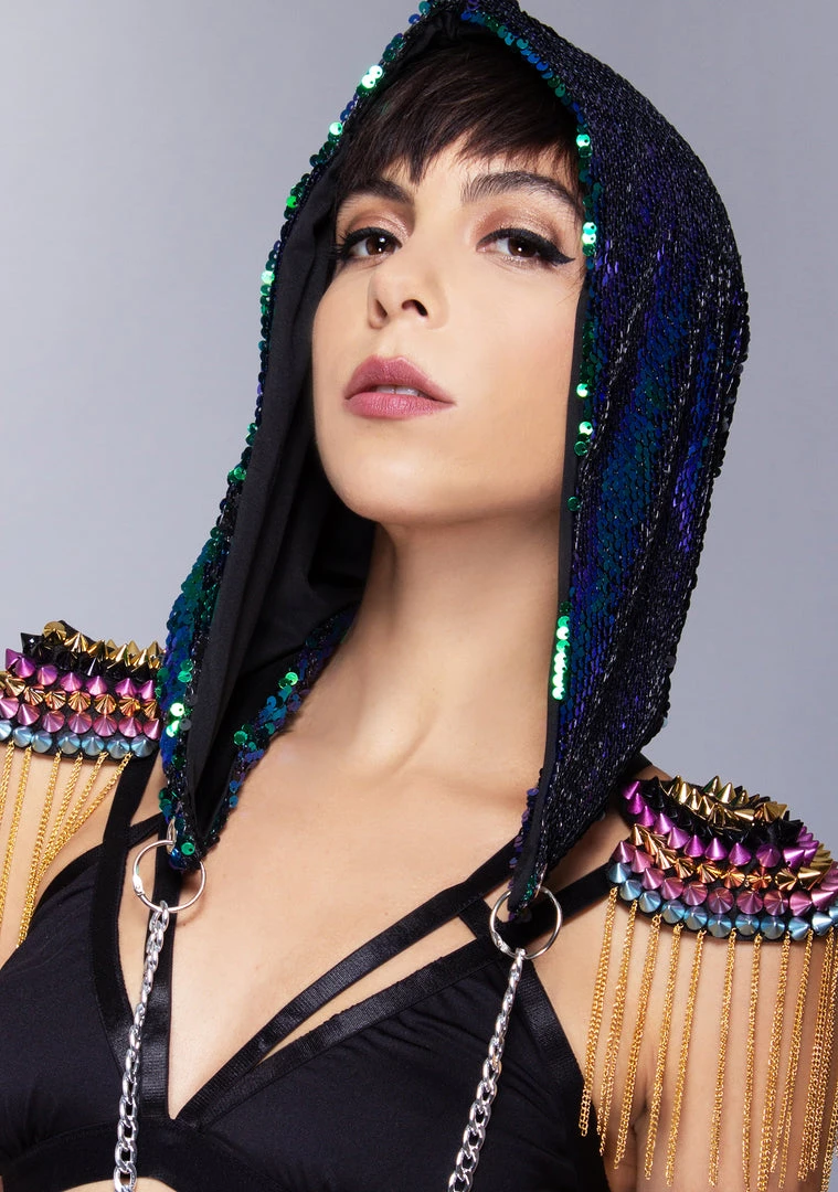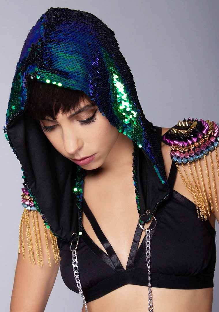 Enter the mystical realm with the Nocturnal Groove Sequin Hood from LASR. This dark-magic rave accessory features a witchy 2-tone matte black and green flip sequin construction, lux chrome chain link accents and breathable black lining. No one can stop your shine in this shimmering festival hood.