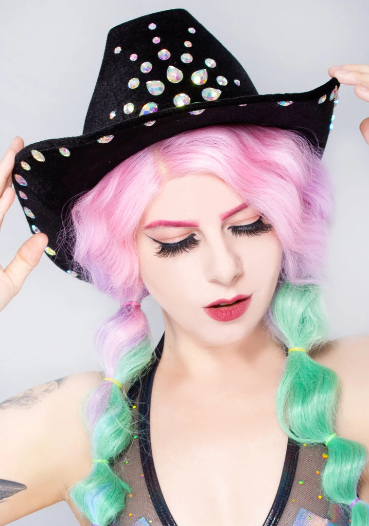 Kick up some dust and dance the night away while wearing the Sharp Shooter Cowgirl Rhinestone Festival Hat from LASR. These killer rave festival hats feature a black base with sparkling gem detail and a white drawstring. If looks could kill you would be the deadliest dame around.