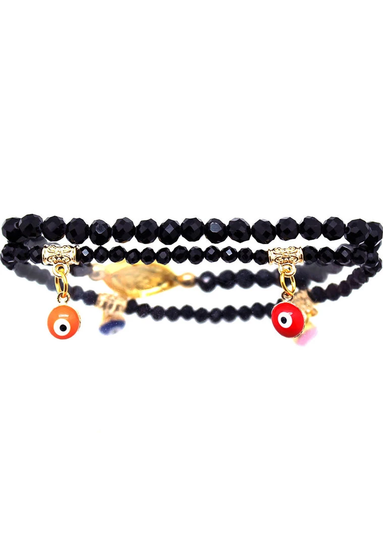 Protect yourself against negative energy and bad vibes with this beautiful Crystal Evil Eye Beaded Bracelet by LASR. This Punk Bracelets set of two features a yellow gold plated evil eye symbol embedded with Swarovski crystals, dangling evil eye charms, and polished fire beaded stones.