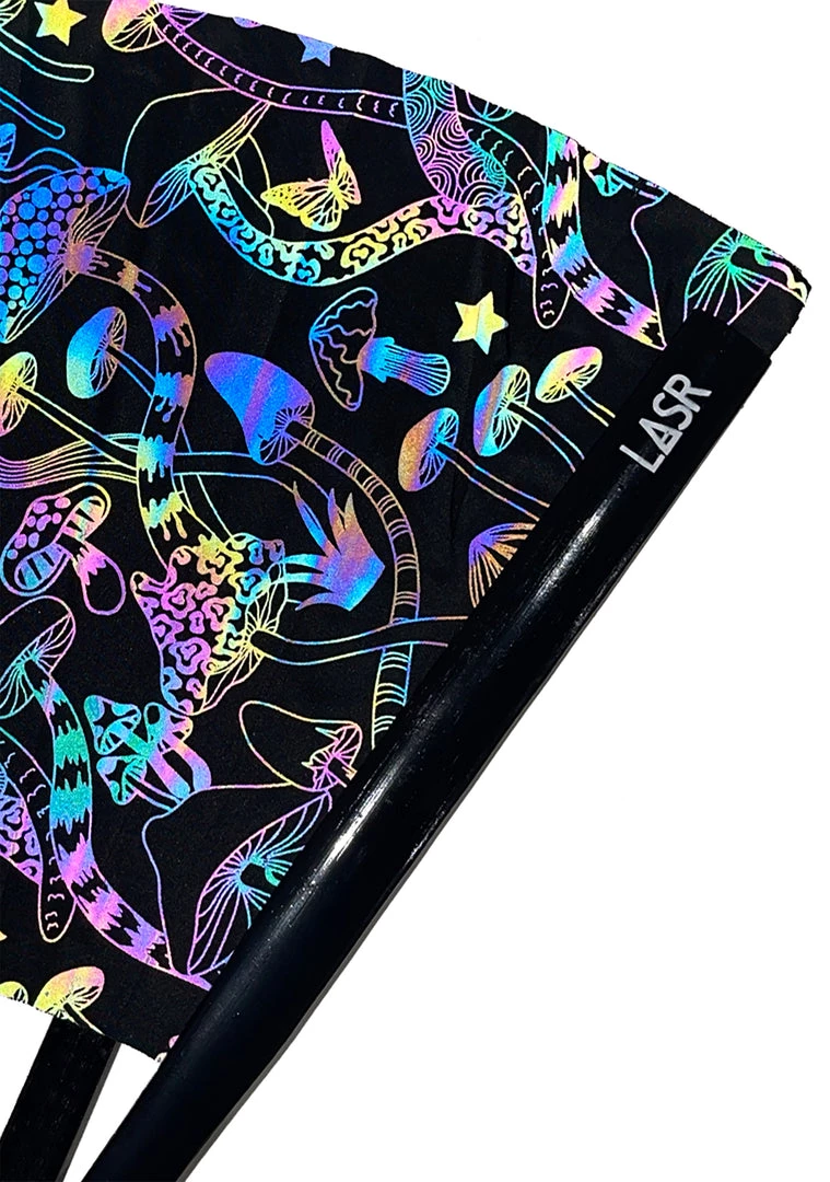 Head down the rabbit hole with the LASR Trippy Mushroom Reflective fan! This fabulously psychedelic rave accessory features a polyester material that is black and then transforms into a trippy reflective mushroom forest once it hits the light. With durable bamboo ribs and steel rivet, this festival fan is ready to rave all night long! Grab this cute fan and feed your head!
