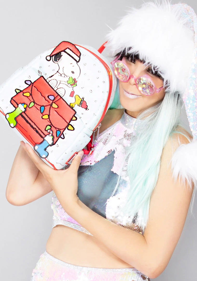The Peanuts Snoopy & Woodstock Gift Giving Mini Backpack is the greatest gift of all. This fantastic festival backpack features a vegan leather outer with printed and glow-in-the-dark details, a zipper closure front pocket with swinging stockings, a top handle, a zip closure main compartment, and adjustable straps. This is the season!