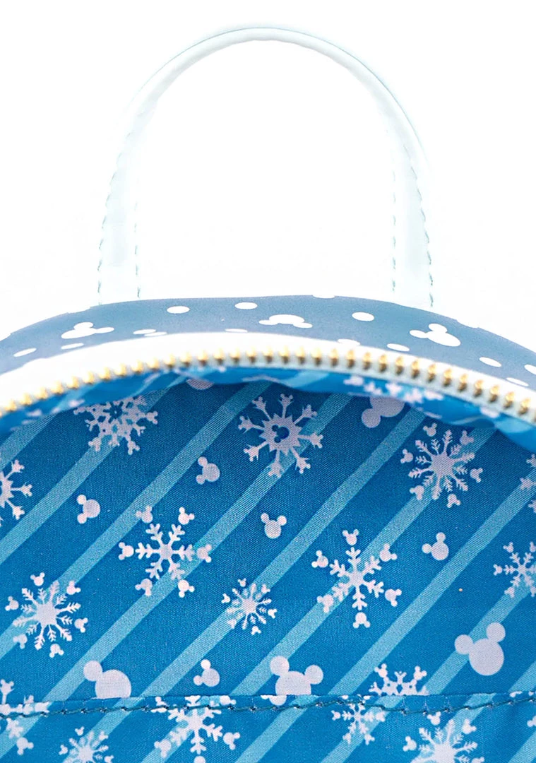 Dance in the snow flurries with the Disney Mickey & Minnie Snow Globe Mini Backpack from Loungefly. This adorable festival backpack features a vegan leather outer with printed details, a front zipper closure pocket with a clear snow globe front with snow, zip-top closure, and adjustable straps. #letitsnow