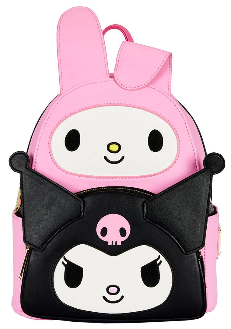 Get the best of both worlds while wearing the Sanrio My Melody Kuromi Double Pocket Cosplay Mini Backpack from Loungefly. These adorable festival backpacks feature Kuromi and My Melody on a vegan leather base, with an exterior front zippered pocket, top handle, zip-top closure, and dual padded adjustable straps. #HeyBestie