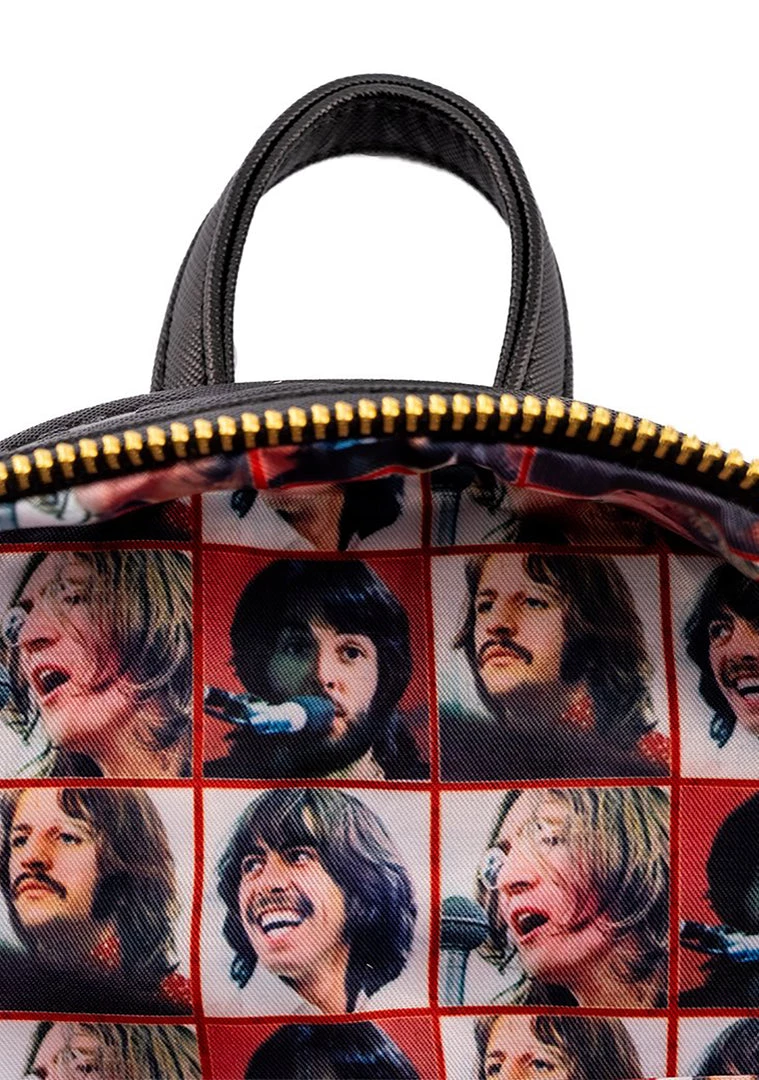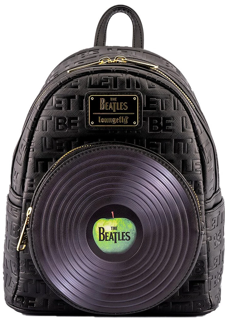 Enter the Rock & Roll Hall of Fame with The Beatles Let it Be Vinyl Record Mini Backpack from Loungefly. This iconic festival backpack features a vegan leather outer with debossed and printed details, zipper closure front pocket, top handle, and adjustable straps. Grab this cute mini backpack and let it be!