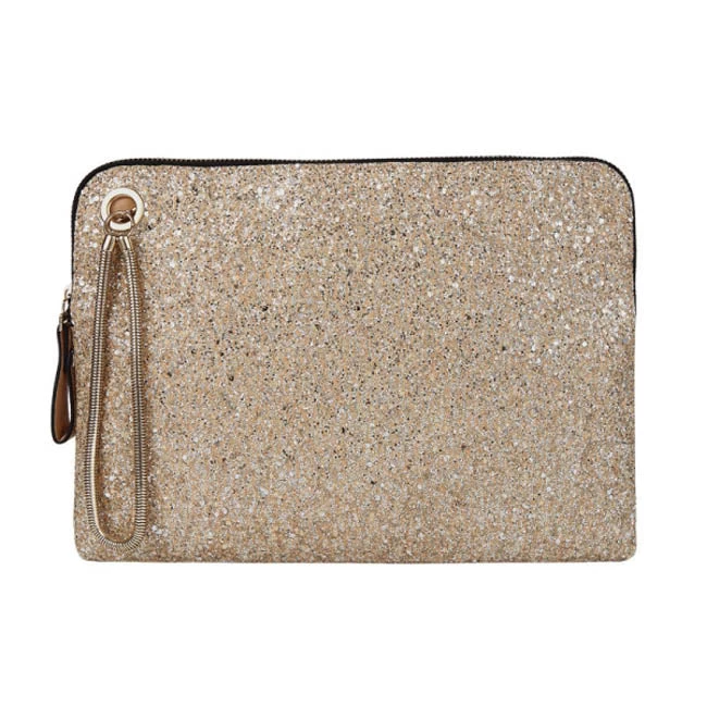Capture all the attention with our sparkling Monroe Glitter Clutch Crossbody purse. This eye-catching clutch features a full front gold glitter detail with gold hardware accent; can be used as wristlet, contrast with PU leather backing with zipper pocket, optional shoulder strap, fully lined interior, and top zip closure.