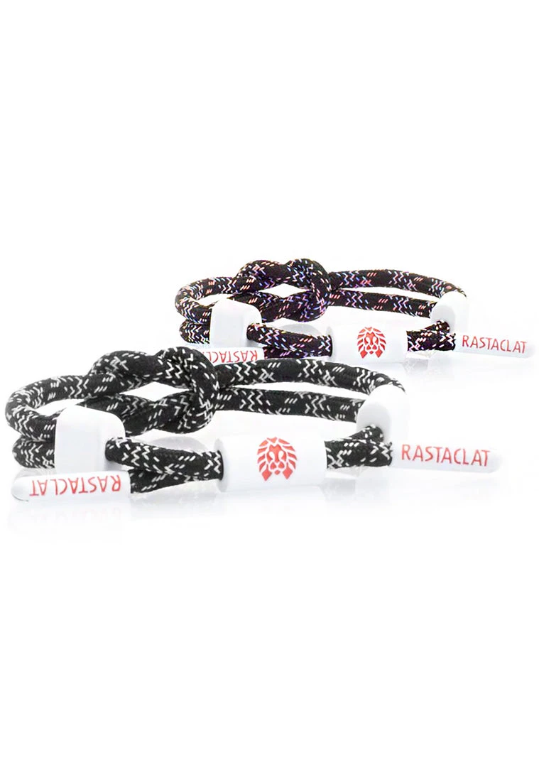 We’re scouring the internet and no other music festival bracelets hold a flame to this Rastaclat Tropical Glitch Dark Net Miniknot in Black/White. This adjustable mini festival bracelet features a versatile black cord design with baby pink, baby blue, and pastel-colored striped threaded accents. Featuring white rubberized hardware and red signature Rastaclat logo emblems, this Rastaclat knot bracelet is midnight rave, dark web and summer festival adventure approved.