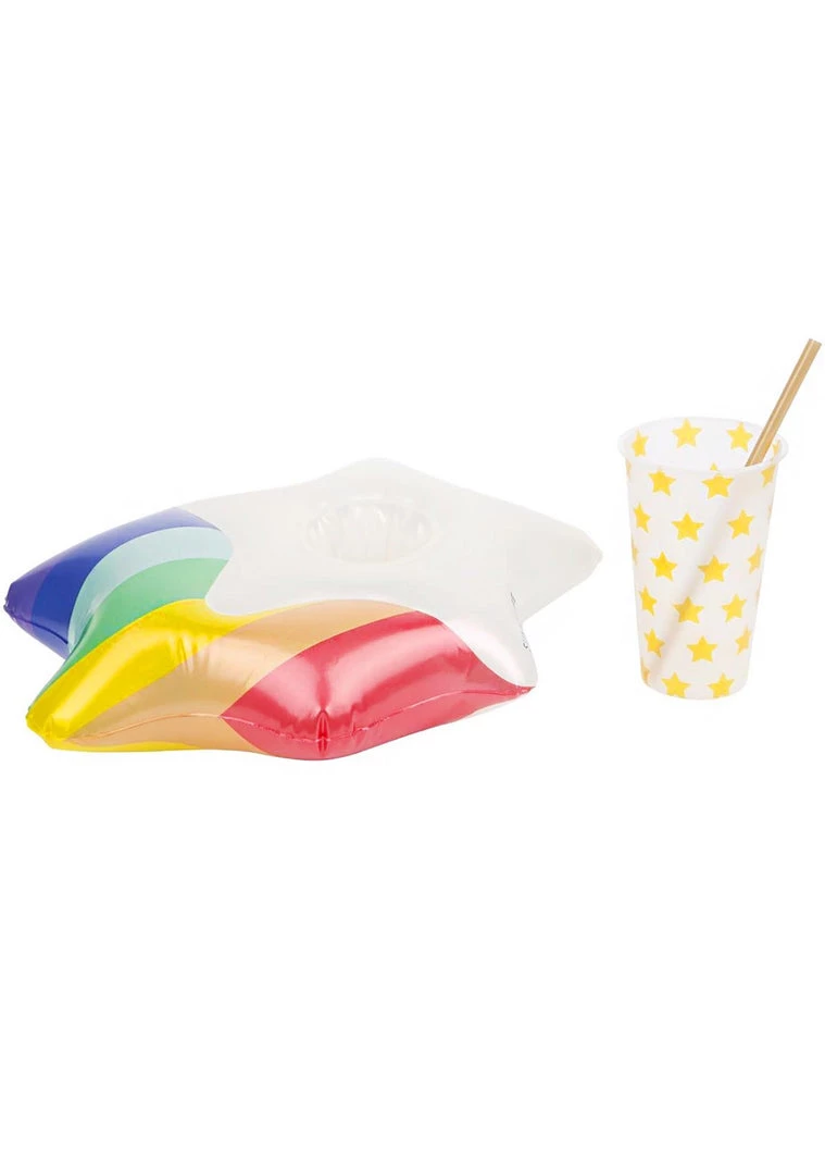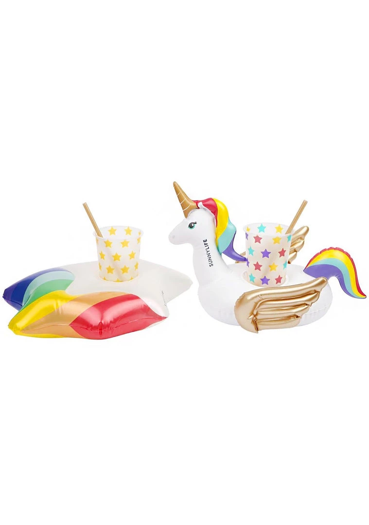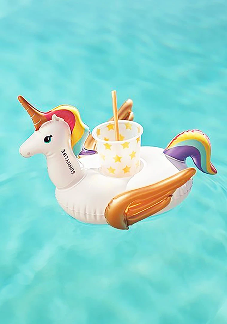 Get your drink on with the Party Wonderland Inflatable Drink Holders by Sunnylife. Made for two, it features two drink holders, two straws, and two cups with rainbow stars all over. A magical unicorn and star pillow keep your drinks afloat. Perfect for sippin’ poolside, it’s made with non-toxic PVC. Includes repair patch. Do it for the ‘gram!