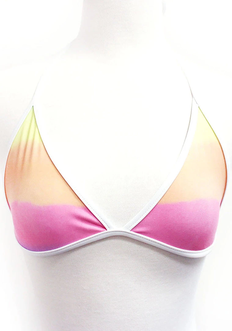 Time to sip on a glass of tequila on the beach in our Sunset Bikini collection from Wildfox. This colorful Party Bikini top features an all-over rainbow print reverses into a dreamy tropical beach scene. All string ties are finished by gold Wildfox charms, in a shiny polyester spandex blend.
