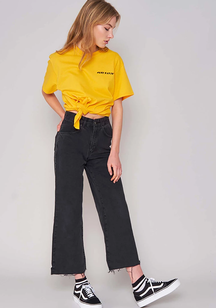 Who cares what they’re sayin’ while your wearing the Opinions Tee from The Ragged Priest. This trendy rave t shirts is 100% cotton and comes in a cropped style with side tie and “just sayin,” print detail, short sleeves and scoop neckline in an oversized fit.
