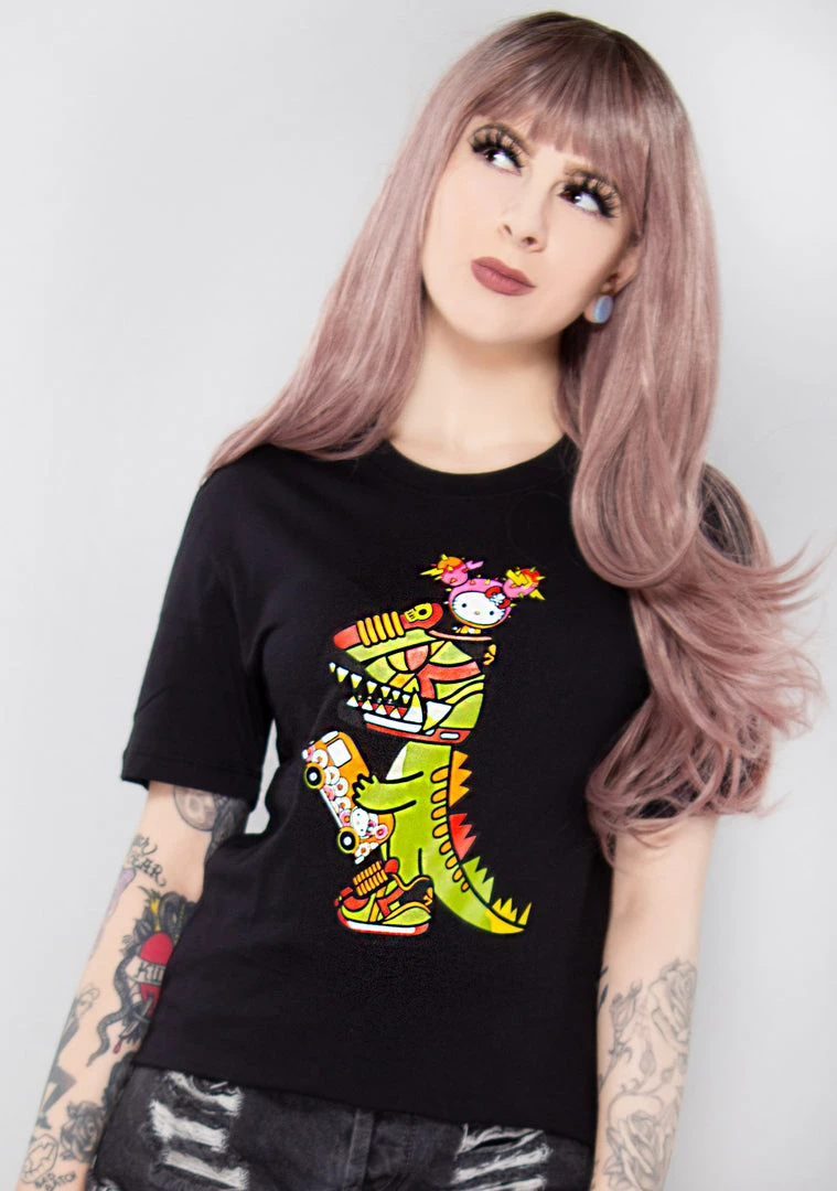 Tear up the town in the Hello Kaiju Attack Tee from tokidoki. This rad rave T-shirt features a black cotton short sleeve tee with graphic printed on the front and a logo printed on the back. #RAAWR