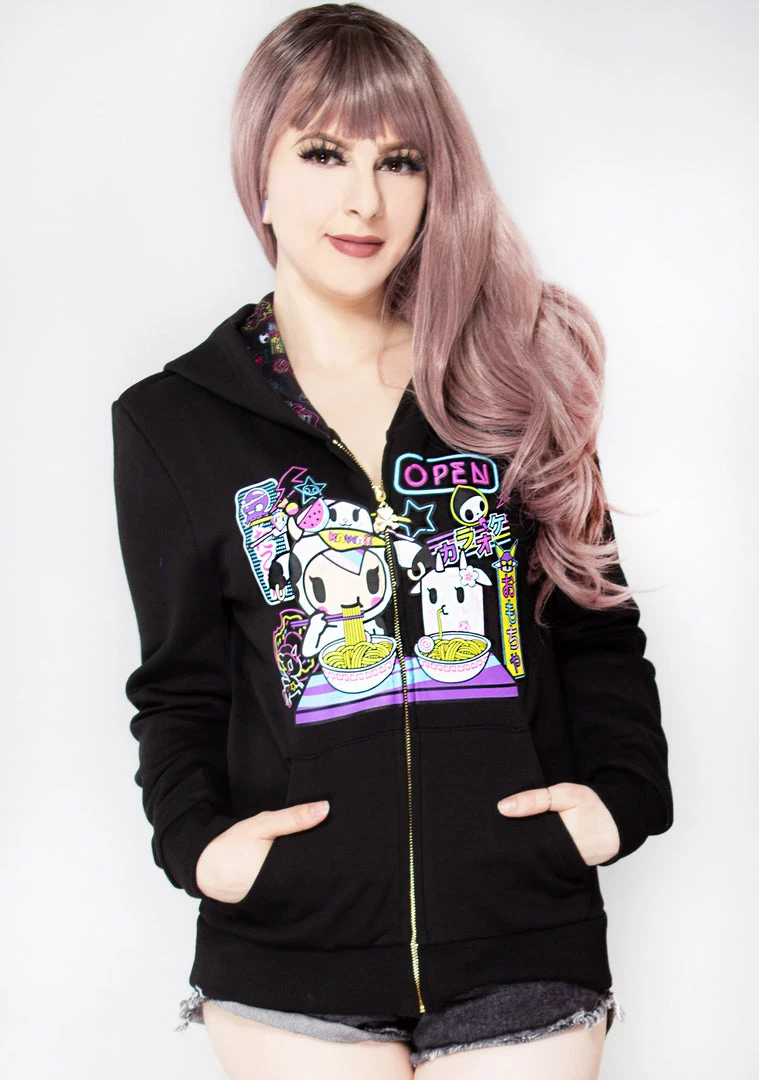 Party on in the Late Night Zip Up Hoodie from tokidoki. This cute rave hoodie features a black long sleeve with printed graphic, zip-up front, printed interior, and attached hood. We’ll sleep when we’re dead.