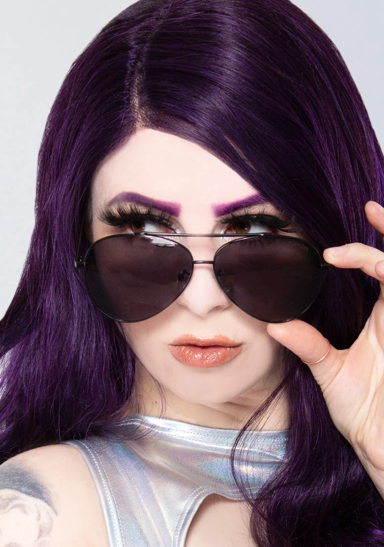Give em’ the message of “Do Not Disturb” when wearing these cool af Amelia Jet Black Sunglasses from Topfoxx. These edgy festival sunglasses feature a bold black metal aviator frame with comfy nose padding and black smoke lenses. #bossbabe attitude.