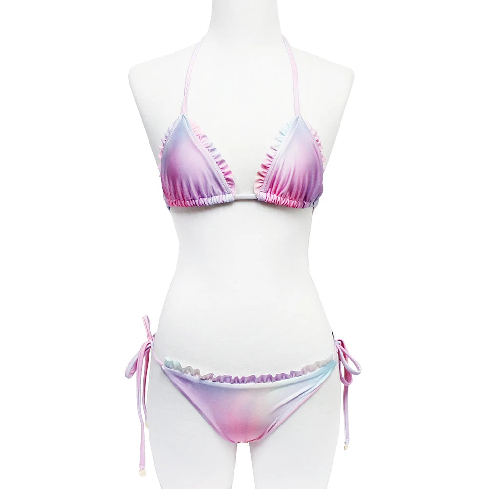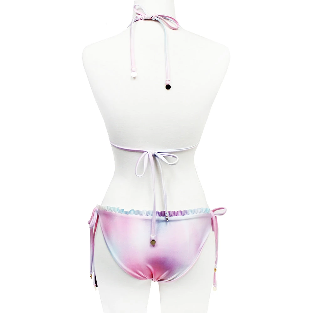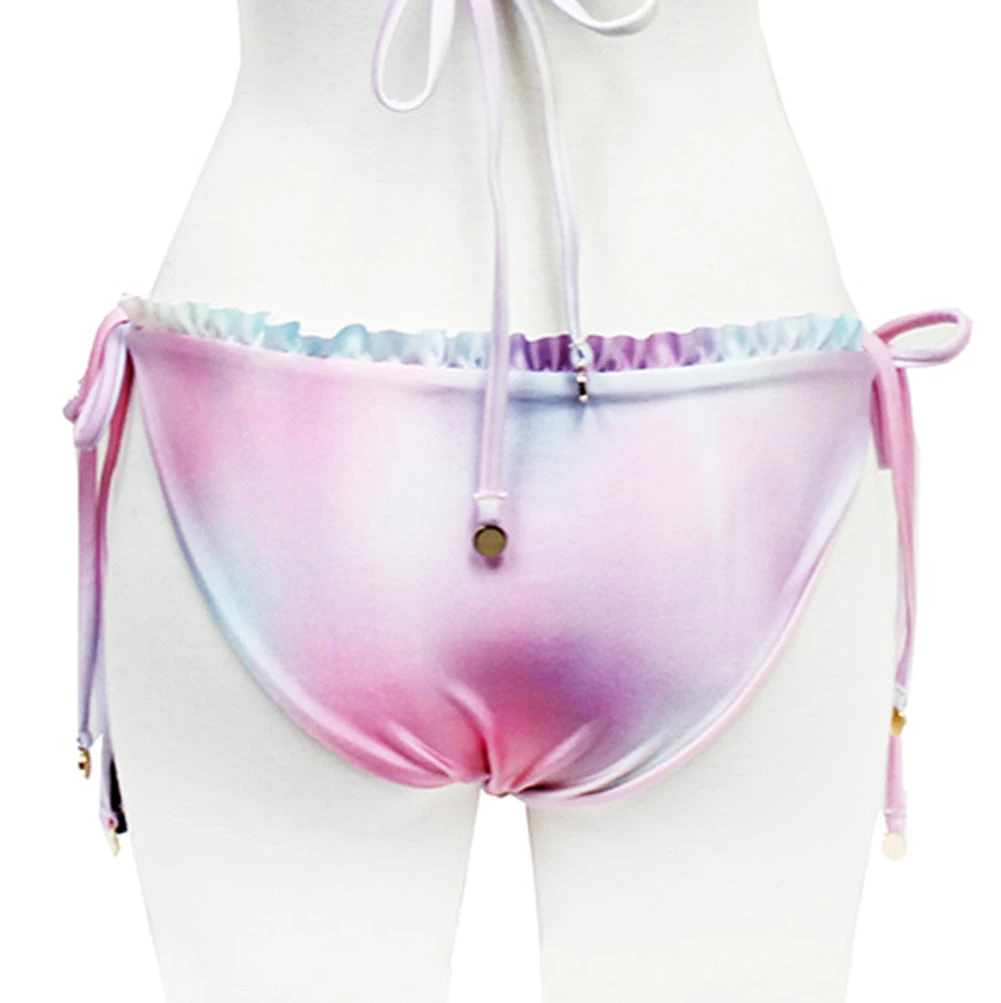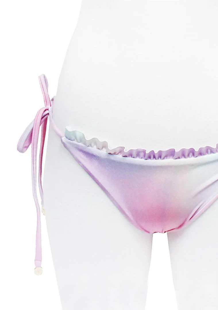 Make magical waves when wearing the Fairy Hologram String Bikini bottom from Wildfox. This fairy fantasy bottom feature a low-rise waist with ruffle detail on shiny polyester spandex blend and string ties at the hips. Ties finished with gold Wildfox charms.
